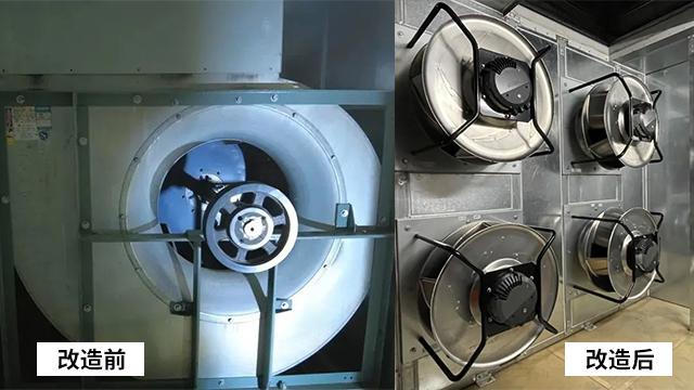 據了解,從前的寫字樓空調系統離心風機都是采用的一臺帶變頻器的皮帶輪蝸殼離心風機,這種離心風機不僅尺寸大、能耗高、噪音大、只具有兩檔的手動調速、每年的定期停機維護,而且一旦離心風機發生故障,整層的空調系統將陷入癱瘓。