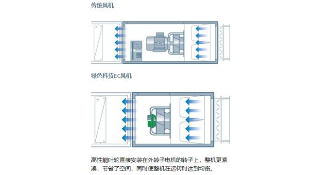 ahu空調(diào)新風機組采用的是綠色科技的EC離心風機,其控制電子和電機集成于一體,不但節(jié)省空間,而且還簡化了安裝。EC風機使用了可用于換向和控制的集成電子系統(tǒng)替代外部變頻器。此外,電機和控制電子之間巧妙協(xié)同,因此無需使用額外的電子濾波器和屏蔽電纜,也不需要外部電機保護開關(guān)。EC風機能夠有效節(jié)省組件之間高昂的匹配調(diào)試費用,無需接地和屏蔽。即插即用就是這么簡單。
